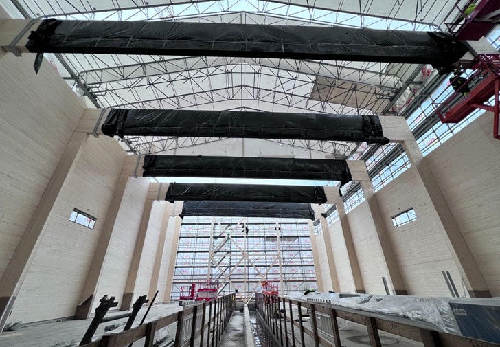 Työ suoritettiin avattavan sääsuojan sisällä, mikä vaati erityistä huolellisuutta työjärjestyksen ja kuormien toimitusten suunnittelussa. Kattoa avattiin niiltä kohdilta, joihin kulloinkin asennettiin levyjä.